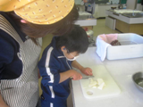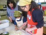 低・中・高学年の2人ずつで班を作り調理に挑戦しました。両手で