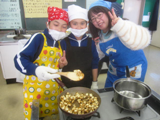 保護者の方といっしょに、みんなでおいしい味噌汁と、ポップコーンに
