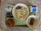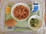 <今日の献立>『バターロール(いちごジャム)・牛乳・なす入りミートスパゲッティ・グリーンサラダ・オレンジ』です。