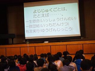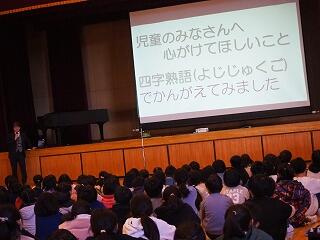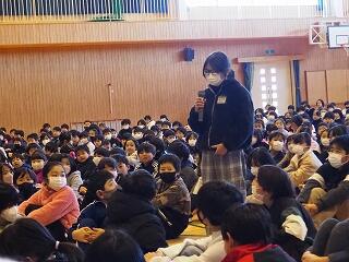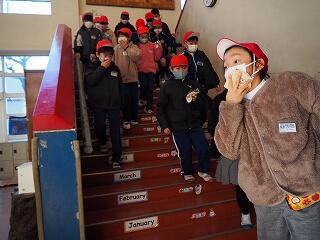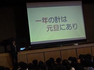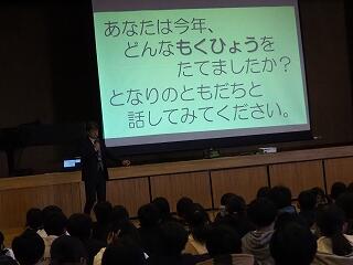 校長先生からの「2学期の始業式の日に立てた自分の目標は達成できたかな?」という質問から始まりました。「人の役に立つこと」ができたかどうか周りの人と話し合ってみようという投げかけに、一人一人の児童が自分はどんなことで役に立てたか活発に話し合い、上級生が何人か発表してくれました。「『一年の計は元旦にあり』ということで、是非新たな目標を考えて、幸せな1年が迎えられるようにしましょう」とお話しをいただきました。さらにもう一つ、校長先生からの投げ掛けがありました。来年は大室小学校の創立150周年となるため、どのような記念行事がやりたいか意見を考えて聞かせてほしいということでした。冬休み中に考えてみてください。