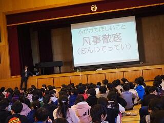 いよいよ今日から3学期が始まりました。体育館に集まった子供たち全員が、校長先生の新年のあいさつに、元気に大きな声で応えていました。終業式にお話があった「一年の計は元旦にあり」を思い出して、友だち同士で今年の目標を話し合いました。さらに、校長先生から、今年の目標にしていきたい「凡事徹底」という言葉と意味についてお話をいただきました。「凡事徹底」とは、あたりまえのことを徹底して行うということです。あたりまえのことをあたりまえに行うということは、簡単そうで実は大変難しいことです。でも、それができることで一回りも二回りも大きく成長します。一人一人がしっかり意識して生活していきましょう。