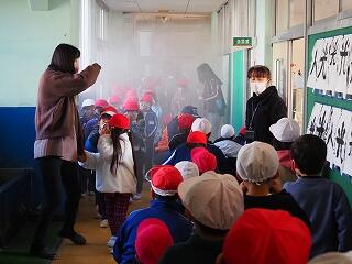 1月10日(水)、全校で避難訓練が行われました。地震から火災が発生したという想定での避難の仕方について訓練しました。元旦に、石川県の能登半島で震災被害が起きたばかりということもあり、全員が真剣な態度で取り組むことができていました。さらに、5、6年生は、消化器を使った初期消火の仕方を教わりました。代表になった児童が、実際に水消火器を使った消火の仕方を体験しました。また、児童全員が煙の中でどのように避難すればよいか体験しました。有害な煙を吸い込まないように姿勢を低くして、手で壁を確認しながら壁づたいに進む貴重な体験ができました。