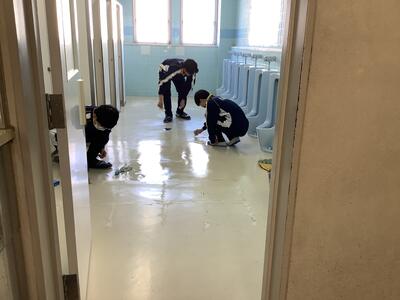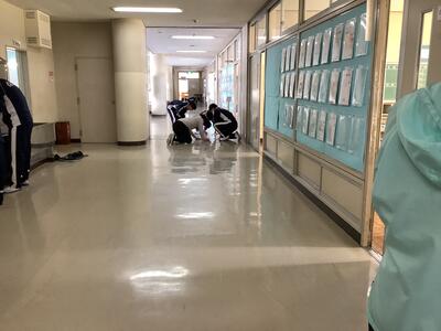 今週から特別日課となった3年生。今日はお世話になった教室やトイレ、図書室などの3階フロアや下駄箱の清掃を行っています。床についた汚れをきれいに落としたり、窓を拭いたり、普段できないところまで隅々美しく磨いてくれました。