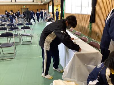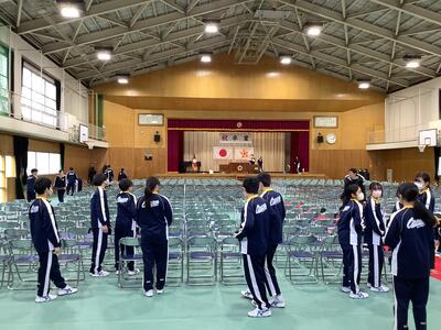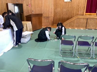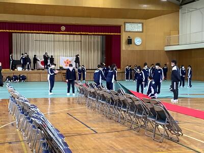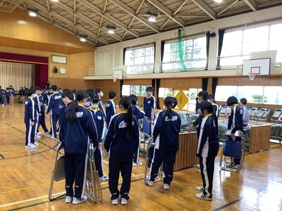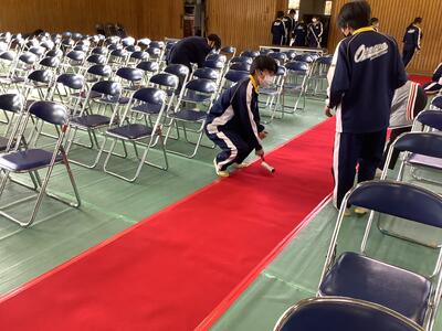 月曜日の卒業式予行練習に向けて、2年生が会場準備を行いました。