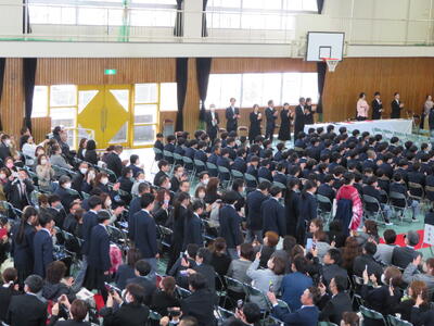 昨夜から早春の雪が降り積もり、3年生の旅立ちをお祝いするかのような清らかな景色の中、令和7年度卒業式が挙行されました。