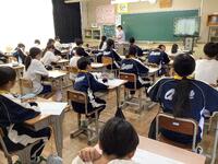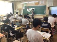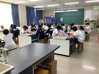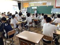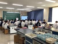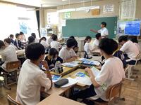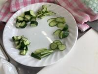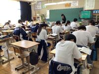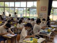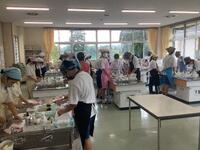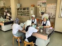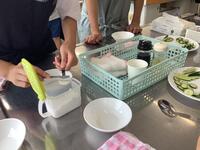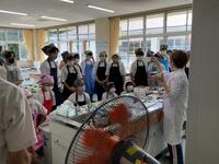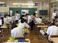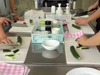 2年生が家庭科の学習で包丁の使い方を学んでいました。きゅうりを使い、小口切り、千切り、拍子切りなどを確認しています。包丁を持たない手は猫の手にして…。各グループで確認し合いながら進めていました。最後は三杯酢でいただきました。