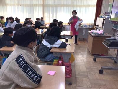 胎児の頃や生まれたときの赤ちゃんの姿・重さなどを理解できるよう、人形を抱っこさせていただきました。人形を抱っこすると、6年生は自然と表情が柔らかくなり、自分も大切に育てられてきたということを感じていたようです。