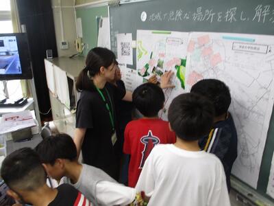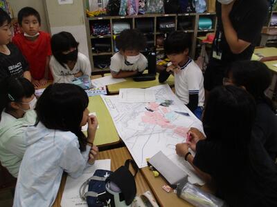 昨年は「地域安全マップづくり」として行っていましたが、今年度は昨年作った安全マップをもとに、通学路や自分の近所の危険箇所や「子ども110番の家」の場所を確認する活動を行いました。
