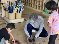 1年生は、球根の植え方をやさしく教えていただきながら、来年入学してくる1年生のためにと一所懸命、作業に取り組みました。4月に自分たちが入学した頃の花壇を思い出しながら・・・。また、作業後はチューリップの育て方についてもお話しいただきました。
