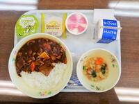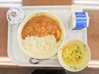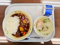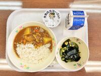 献立:牛乳 麦ごはん チキンカレー こんにゃくサラダ ヨーグルト