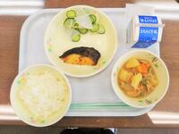 献立:牛乳 ごはん さばのカレー風味焼き 塩昆布和え じゃがいものそぼろ煮