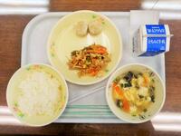 献立:牛乳 ごはん 家常豆腐 焼き餃子 中華和え