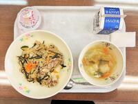 献立:牛乳 鶏肉中華丼 卵のふわふわスープ