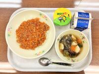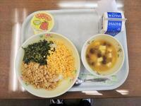 「和風ビビンバ丼」は、具として豚肉、ごぼう、椎茸、しらたき、きざみあげが入っていました。味付けは、おろし生姜、おろしにんにく、さとう、しょうゆ、みりん、豆板醤、いりごまでした。おいしかったです。私は、よく混ぜて食べましたが、子供たちは、混ぜずに食べている子も多かったです。ごちそうさまでした。
