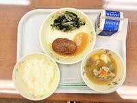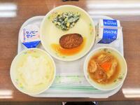 献立:牛乳 米粉パン 煮込みハンバーグ ほうれん草サラダ 春雨スープ