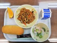 「焼きそば」は、子供たちが「好きな給食ベスト10」に入るメニューです。本日の焼きそばも、とてもおいしかったです。「れんこんサラダ」は、れんこんがシャキシャキしていて、おいしかったです。ごちそうさまでした。