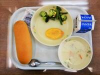 献立:牛乳 コッペパン 照り焼きチキン ブロッコリーサラダ 野菜スープ