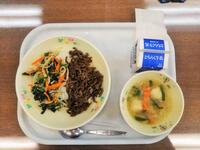 献立:牛乳 和風ビビンバ丼 餃子スープ