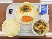 献立:牛乳 ごはん 手作りとんかつ カリコリサラダ ニコニコ汁