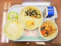 献立:牛乳 ごはん いわしの生姜煮 白菜のもみ漬け 大根と里芋のそぼろ煮 福豆