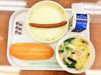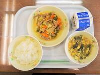 献立:牛乳 ごはん 豚肉と野菜の生姜炒め 中華風コーンスープ