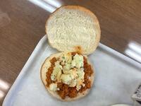 ミルクパン」に「スラッピージョー」と「グリーンポテト」を挟んで食べました。「がぶり」とかぶりつきました。おいしかったです。ごちそうさまでした。
