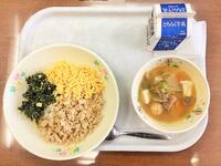 献立:牛乳 三色丼 鮭団子汁