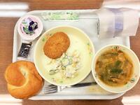 今日は「県民の日献立」でした。県産豚肉のコロッケはジューシーでおいしかったです。県産かんぴょうのサラダは、ドレッシングと合っていておいしかったです。県産にらのスープは、えび、豚肉、にら、キャベツ、人参、椎茸と具沢山でおいしかったです。栃木県さん、お誕生日、おめでとうございます。ごちそうさまでした。