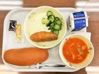 献立:牛乳 米粉パン 豚肉コロッケ 小袋ソース かんぴょうサラダ にらのピリ辛スープ 県民の日デザート