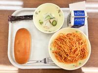 献立:牛乳 コッペパン ナポリタン ほうれん草サラダ 県産とちおとめジャム