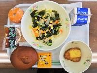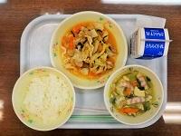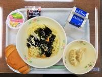 「ワンタンスープ」は、ワンタンの他、もやし、人参、タマネギ、にら、なると、たけのこ 椎茸が入っていて、美味しかったです。生姜は入っていなかったのに、生姜の味がしました。、栄養教諭に訊いてみたところ、ワンタンの中の生姜味がしみ出たのではないか、とのことでした。ワンタンすごい、と思いました。