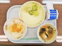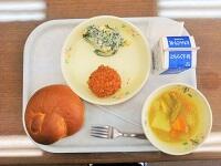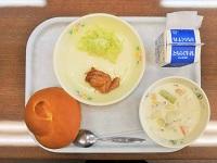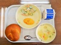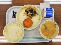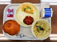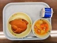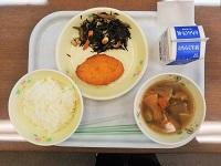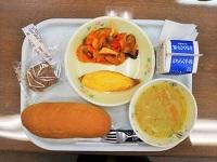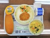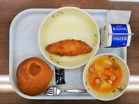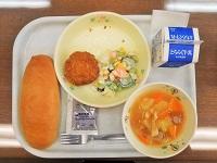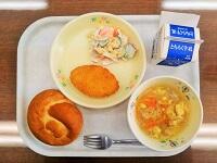 献立:牛乳 米粉パン 野菜コロッケ かんぴょうサラダ オニオンスープ