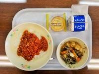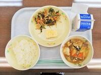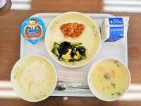 献立:牛乳 ごはん 豚キムチ ほうれん草と豆腐のスープ