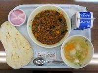 献立:牛乳 ナン なす・ズッキーニ入りドライカレー えび団子スープ とちおとめアイス