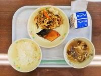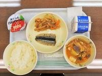 献立:牛乳 ごはん さば四川みそ焼き もみ漬け いなか汁