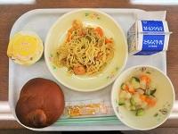献立:牛乳 コッペパン 夏野菜スパゲティ グリーンサラダ パインクレープ チョコレートパテ