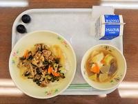 献立:牛乳 ごはん 豚肉と野菜のみそ炒め タイピーエン