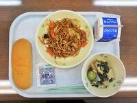献立:牛乳 黒ロール えびの上海風焼きそば カリコリサラダ レモンゼリー はちみつ