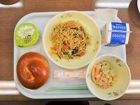 献立:牛乳 米粉パン クリームスパゲティ こんにゃくサラダ セノビゼリー