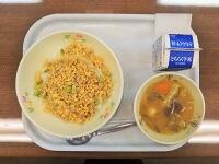 「タイピーエン」は、栄養教諭の話によると春雨スープの一種だそうです。その他、鶏肉、生姜、ニンニク、ねぎ、なると、椎茸、きくらげ、にんじん、たけのこ、チンゲンサイが入っていました。更に、3種類のスープの素が使われ、濃厚な味で美味しかったです。私のタイピーエンには、なるとがたくさん入っていました。こうなると味は更に美味しくなります。