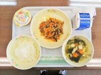 献立:牛乳 ごはん プルコギ風炒め物 わかめスープ 豆乳プリン