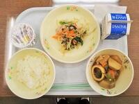 本日の給食は、野菜がたくさんありました。「ハムとにらの和え物」には、にら、人参、もやしです。「里芋と野菜のうま煮」では、里芋、人参、大根、こんにゃく、絹さやです。野菜は体の調子を整えます。お昼の放送で給食委員が、「にらは疲れをとる効果があります。」と放送していました。
