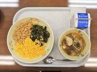 献立:牛乳 三色そぼろ丼 きのこけんちん汁