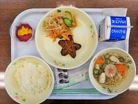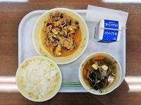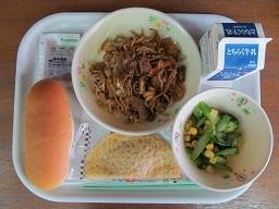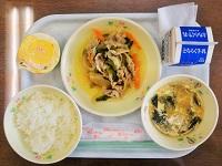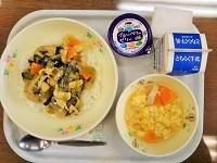 献立:牛乳 ごはん 豚肉のしょうが炒め 中華風コーンスープ レモンゼリー