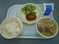 献立:牛乳 ハンバーグおろしソース キャベツのピリッと漬け 味噌けんちん汁