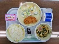 献立:牛乳 ごはん モロフライ かんぴょうサラダ にら玉汁 お祝いケーキ