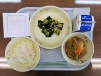 献立:牛乳 ごはん じゃがいものそぼろ煮 納豆 胡瓜の香りづけ