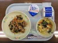 「ビビンバ」は韓国料理です。一般的には、ナムル、キムチ、肉、卵等がごはんの上に乗っています。今日は、和風ということで、牛・豚ひき肉、ごぼう、椎茸、しらたき、あぶらあげが乗っていました。よくまぜ食べました。味がちょうどよく、とても美味しかったです。「やっぱり和風がいいな。」と思いました。