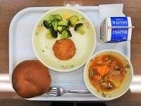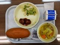 献立:牛乳 ミルクパン 野菜肉団子 かまぼこサラダ 野菜のカレースープ煮