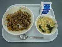 献立:牛乳 スタミナ丼 Caたっぷりスープ セノビーゼリー